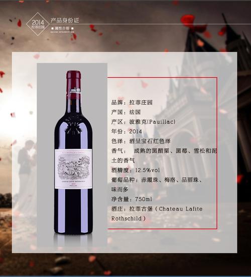 由赤霞珠葡萄搭配梅洛和品丽珠葡萄酿造 拉菲是享誉世界的法国波尔多葡萄酒之一。它本是世界顶级酒庄拉菲古堡(Chateau Lafite Rothschild)的简称,人们习惯把拉。